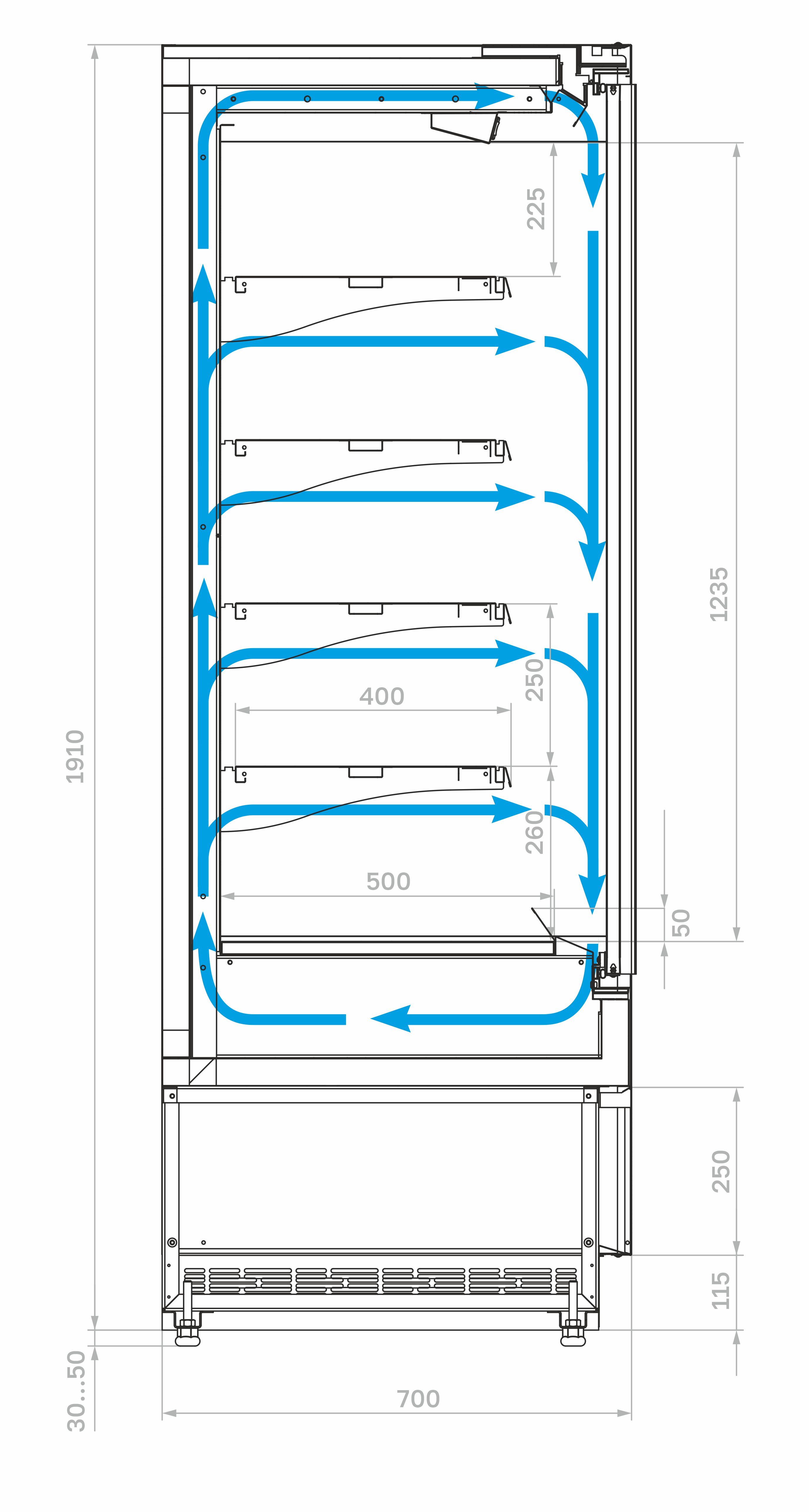 Модель оснащена 4 рядами навесных полок с кронштейнами, 2 распашными дверьми, подставкой с фронтальной термовыводящей и цокольной решетками. Корпус прямоугольной формы изготовлен из стали с антикоррозийным покрытием: Внешние панели, полки и кронштейны — нержавеющая сталь, цоколь и интерьер — черного цвета (RAL 9005). Теплоизоляция выполнена из пенополиуретана.