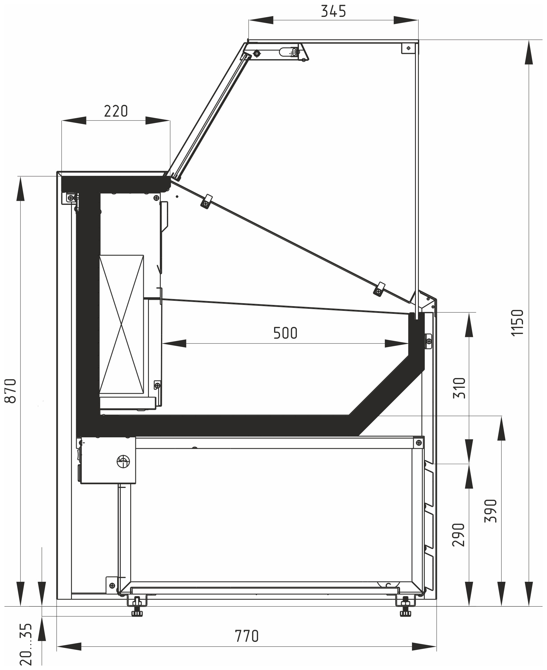 • Регулируемые ножки 20–35 мм — лёгкая установка и выравнивание оборудования.