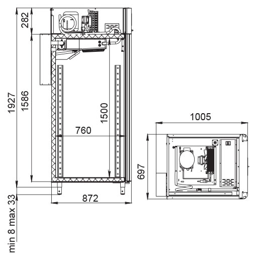 Каталог оборудования Холодильное оборудованиеШкафы холодильныеСпециализированные холодильные шкафыШкаф холодильный для вызревания салями Polair CS107 Salami черный, со стеклом Шкаф холодильный для вызревания салями Polair CS107 Salami черный, со стеклом Код товара: 062-632 Поделиться: WhatsAppTelegram СравнитьДобавить в КПВ избранное 0 373 915 ₽ В корзину 0 шт Под заказСамовывоз сегодня бесплатно Взять в кредит Купить в лизинг Получить консультацию в WhatsApp Описание Характеристики Отзывы 0 Инструкции 5 Шкаф холодильный для вызревания салями Polair CS107 Salami черный, со стеклом предназначен для приготовления и хранения салями, сыровяленых колбас и других мясных деликатесов на предприятиях общественного питания и торговли. Цельнозаливной монолитный корпус выполнен из нержавеющей стали снаружи и внутри (кроме задней стенки), что обеспечивает высокую прочность, долговечность и удобство ухода. Оборудование рассчитано на работу при температуре окружающей среды до +40 °С. Особенности: Динамическое охлаждение с мягким обдувом без заветривания Верхнее расположение агрегата Автоматическая оттайка с системой испарения конденсата Русифицированная многофункциональная панель управления с дисплеем диагональю 5" Возможность создания и сохранения индивидуальных программ Встроенный ультразвуковой увлажнитель (необходима подача очищенной воды и подключение к канализации) UV-лампа для обеззараживания воздуха внутри камеры Три уровня подвесов с тремя перекладинами и крюками на каждом уровне для удобной развески колбас Регулируемый уровень влажности: от 60 до 95 % Распашная дверь с заливной теплоизоляцией, встроенной ручкой и магнитным уплотнителем Отключаемая LED-подсветка камеры Штампованное углубление в дне корпуса для удобства ухода Педаль для удобного открытия двери Хладагент R290 (пропан) Толщина стенки корпуса: 43 мм Polair CS107 Salami черный, со стеклом — это профессиональный холодильный шкаф, идеально подходящий для цехов, гастробаров и мясных мастерских. Он обеспечивает оптимальные условия для дозревания и хранения деликатесов за счёт точного контроля температуры и влажности, продуманной конструкции и расширенного функционала. Такой шкаф помогает сохранять качество и вкус продукции на высоком уровне.Изображение товара, представленного на фото, может отличаться от его фактического вида. Показать все Габаритные размеры697×1005×1960 ммДиапазон рабочей температурыот -2 до +30 °CДлина697 ммШирина1005 ммВысота1960 ммОбъём700 лКол-во дверей1 Тип двериСтеклянная Уровень влажностиот 60 до 95 %Холодильный агрегатВстроенный Тип оттайкиАвтоматическая Тип охлажденияДинамическое ПодсветкаЕсть UV-лампаЕсть ХладагентR290 Вес нетто160 кгВес брутто190 кгБрендPolairВсе специализированные холодильные шкафы Из нержавейкиВсе специализированные холодильные шкафы Стеклянная дверь Оставить отзыв Еще никто не оставил отзыв на этот товар Схема POLAIR CS107 Salami.jpgИнструкция на POLAIR CS107 Salami.pdfБрошюра на POLAIR CS107 Salami.pdfДекларация о соответствии.pdfСертификат соответствия.pdf Похожие товары Перейти в каталог Под заказ 391 000 ₽ Шкаф холодильный для вызревания мяса Polair CS107 Meat (Тип 2) Под заказ 419 900 ₽ Шкаф холодильный для хлебопекарных производств Polair CS107-Bakery Br со стеклом (Тип 2) Под заказ 405 450 ₽ Шкаф холодильный для хлебопекарных производств Polair CS107 Bakery Br черный, со стеклом (Тип 1) Под заказ 385 475 ₽ Шкаф холодильный для вызр