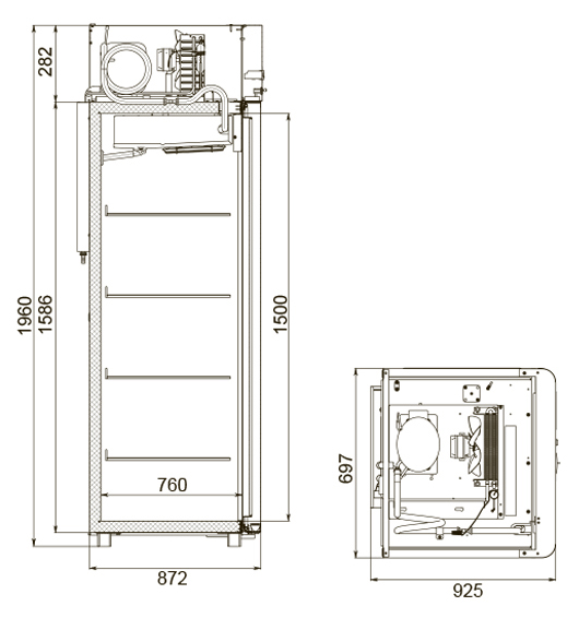 Каталог оборудования Холодильное оборудованиеШкафы холодильныеШкафы холодильные универсальные от -5 до +5 °СШкаф холодильный универсальный Polair CV107-Gm Alu Шкаф холодильный универсальный Polair CV107-Gm Alu Код товара: 062-610 Поделиться: WhatsAppTelegram СравнитьДобавить в КПВ избранное 0 149 175 ₽ В корзину 0 шт Под заказСамовывоз сегодня бесплатно Взять в кредит Купить в лизинг Получить консультацию в WhatsApp Описание Характеристики Отзывы 0 Инструкции 4 Шкаф холодильный универсальный Polair CV107-Gm Alu предназначен для демонстрации и надежного хранения продуктов на предприятиях общественного питания и торговли. Корпус шкафа цельнозаливной, выполнен из прочной стали с полимерным покрытием, что гарантирует высокую механическую прочность и длительный срок службы. Алюминиевые профили дверей и верхней панели подчеркивают современный, премиальный дизайн. Оборудование эффективно работает при температуре окружающей среды до 40 °С и влажности воздуха до 80%. Особенности модели: Многофункциональная контрольная панель (терморегулятор) для удобного управления параметрами. Жидкокристаллический дисплей, обеспечивающий чёткое отображение настроек и информации о работе шкафа. Клапан Шредера для удобного обслуживания холодильного контура. Распашной тип двери для легкого доступа к продуктам. Возможность изменить сторону открывания двери (при наличии опции), что делает установку более универсальной. Полностью интегрированные в профили дверей ручки, подчеркивающие стильный внешний вид и удобство использования. Встроенная светодиодная подсветка для отличной видимости содержимого шкафа. Надежный замок для защиты продуктов. Педаль для удобного открывания двери без использования рук. Высокая допустимая нагрузка на полку — до 40 кг, что позволяет хранить большие объемы продукции. Размер полки: GN 2/1 (530×650 мм), подходит для стандартных гастроемкостей. Толщина стенки корпуса — 43 мм, обеспечивающая отличную теплоизоляцию и снижение энергопотерь. Polair CV107-Gm Alu — это функциональный и стильный холодильный шкаф, который сочетает надежность, эргономичный дизайн и удобство эксплуатации. Использование прочных материалов и продуманная конструкция делают его идеальным решением для профессиональной кухни или торгового зала.Изображение товара, представленного на фото, может отличаться от его фактического вида. Показать все Габаритные размеры697×925×1960 ммДиапазон рабочей температурыот -5 до +5 °CДлина697 ммГлубина925 ммВысота695 ммОбъём700 лРазмер полки530×650 ммКоличество полок4 штКоличество дверей1 штТип оттайкиАвтоматическая Тип охлажденияДинамическое Тип управленияЭлектронное Материал корпусаНержавеющая сталь Тип двериМеталлическая ЗамокЕсть Способ открыванияРаспашные ХладагентR290 Холодильный агрегатВстроенный Расположение агрегатаВерхнее Потребление электроэнергии в сутки4,5 кВтПотребляемая мощность0,4 кВтНапряжение220 ВГабариты в упаковке800×1000×2150 ммВес нетто115 кгВес брутто140 кгБрендPolairВсе шкафы холодильные универсальные от -5 до +5 °С Из нержавейки Оставить отзыв Еще никто не оставил отзыв на этот товар Схема POLAIR CV107-Gm Alu.jpgИнструкция на POLAIR CV107-Gm Alu.pdfДекларация о соответствии.pdfСертификат соответствия.pdf Похожие товары Перейти в каталог В наличии 130 815 ₽ Шкаф холодильный универсальный МХМ Капри 1,5 УСК купе Под заказ 101 178 ₽ Шкаф холодильный универсальный Arkto V0.5-G В наличи