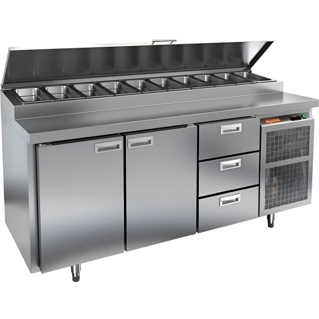 Стол холодильный HiCold PZ1-113GN (1/3H) — функциональный и удобный стол для пиццы и салатов, совмещающий рабочую поверхность, охлаждаемый блок, полки и ящики для хранения. Разная глубина гастроёмкостей и продуманная организация рабочего пространства делают его оптимальным решением для профессиональной кухни.