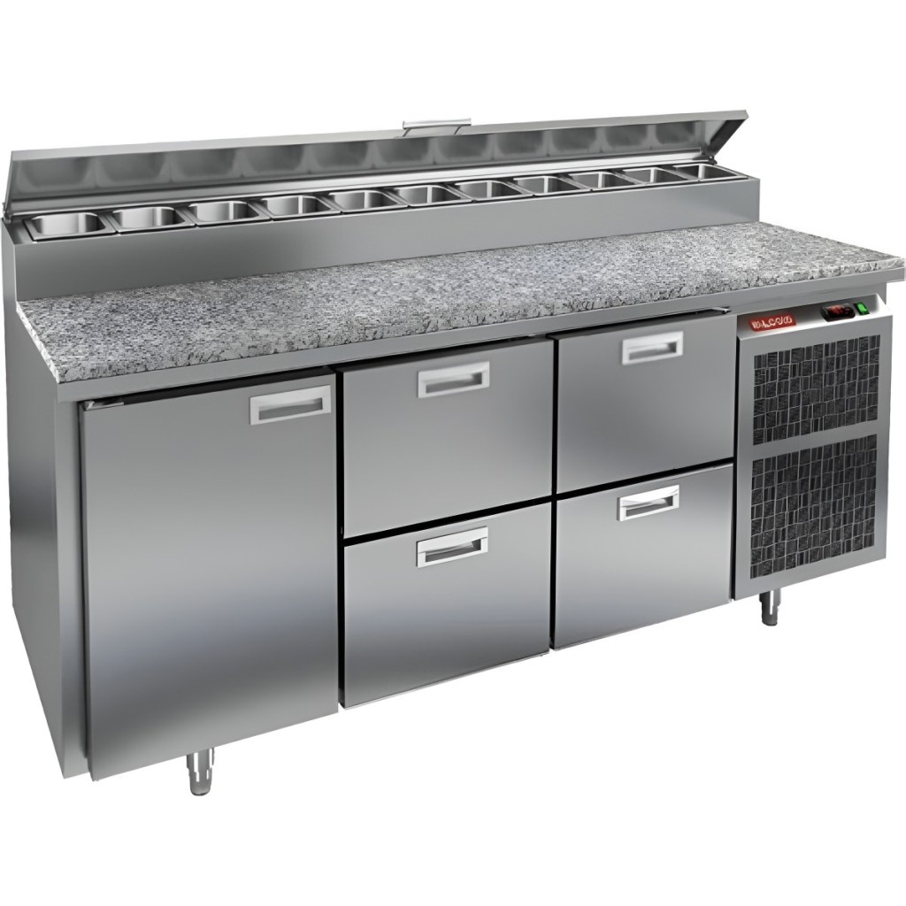 Каталог оборудования Холодильное оборудованиеСтолы охлаждаемыеСтолы холодильные для пиццыСтол холодильный для пиццы HiCold PZ2-122GN (1/6) камень Стол холодильный для пиццы HiCold PZ2-122GN (1/6) камень Код товара: 064-757 Поделиться: WhatsAppTelegram СравнитьДобавить в КПВ избранное 0 308 061 ₽ В корзину 0 шт Под заказСамовывоз сегодня бесплатно Взять в кредит Купить в лизинг Получить консультацию в Max Описание Характеристики Отзывы 0 Стол холодильный для пиццы HiCold PZ2-122GN (1/6) камень предназначен для кухонь и предприятий общественного питания. Он используется для раскатки теста, подготовки ингредиентов для пиццы, салатов и других блюд, а также для охлаждения и кратковременного хранения скоропортящихся продуктов. Модель совмещает гранитную рабочую поверхность и охлаждаемый отсек с 1 дверью и 4 ящиками, обеспечивая удобный доступ к ингредиентам и эффективное хранение. Особенности: Динамическая система охлаждения для равномерного поддержания температуры Автоматическая оттайка для удобного обслуживания Электронная панель управления для точной настройки параметров Вместительная внутренняя полка формата GN 1/1 (размер 530×325 мм) 1 дверь и 4 вместительных ящика для хранения ингредиентов Автоматические доводчики дверей с фиксатором открытого положения Легкозаменяемые магнитные уплотнители для герметичности Открытая агрегатная часть для легкого доступа к компонентам Регулируемые по высоте ножки для устойчивости Гранитная рабочая поверхность глубиной 486 мм и толщиной 50 мм — устойчива к повреждениям, высоким температурам и царапинам Толщина теплоизоляции: 50 мм Максимальная глубина гастроемкостей: 100 мм Вместимость салат-бара: 11 гастроемкости Стол холодильный HiCold PZ2-122GN (1/6) камень — это надёжный и функциональный стол для пиццы. Он сочетает рабочую поверхность и охлаждаемый отсек, облегчает хранение и подготовку ингредиентов, повышает удобство работы повара и соответствует стандартам профессиональной кухни.Изображение товара, представленного на фото, может отличаться от его фактического вида. Показать все Габаритные размеры1835×700×1000 ммДиапазон рабочей температурыот +2 до +10 °CРасположение агрегатаБоковое Материал столешницыГранитная Тип столаС дверьми и ящиками Тип двериГлухая Объём350 лТип гастроемкостейGN 1/6 Количество дверей1 штКоличество ящиков4 штРазмер полки530×325 ммНапряжение220 ВМощность0,5 кВтТип охлажденияДинамическое Тип оттайкиАвтоматическая Габариты в упаковке2000×850×1140 ммВес нетто172 кгВес брутто248 кгБрендHicoldВсе холодильные столы для пиццы Hicold Оставить отзыв Еще никто не оставил отзыв на этот товар Ранее просмотрено Под заказ 119 332 ₽ Стол холодильный среднетемпературный HiCold SNEG 11 HT без столешницы Под заказ 121 743 ₽ Витрина холодильная Dazzl Galaxy 080 Plug-in 150 Self динамика