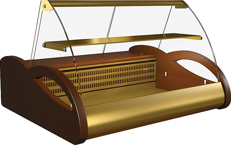 Модель выполнена в современном дизайне с гнутым передним стеклом, которое обеспечивает хороший обзор продукции. Корпус изготовлен из стали с теплоизоляцией из ППУ, боковины — из прочного коричневого пластика. Раздвижные задние створки из оргстекла обеспечивают удобный доступ к товарам. Витрина дополнительно оборудована неохлаждаемой верхней полкой для выкладки сопутствующей продукции.
